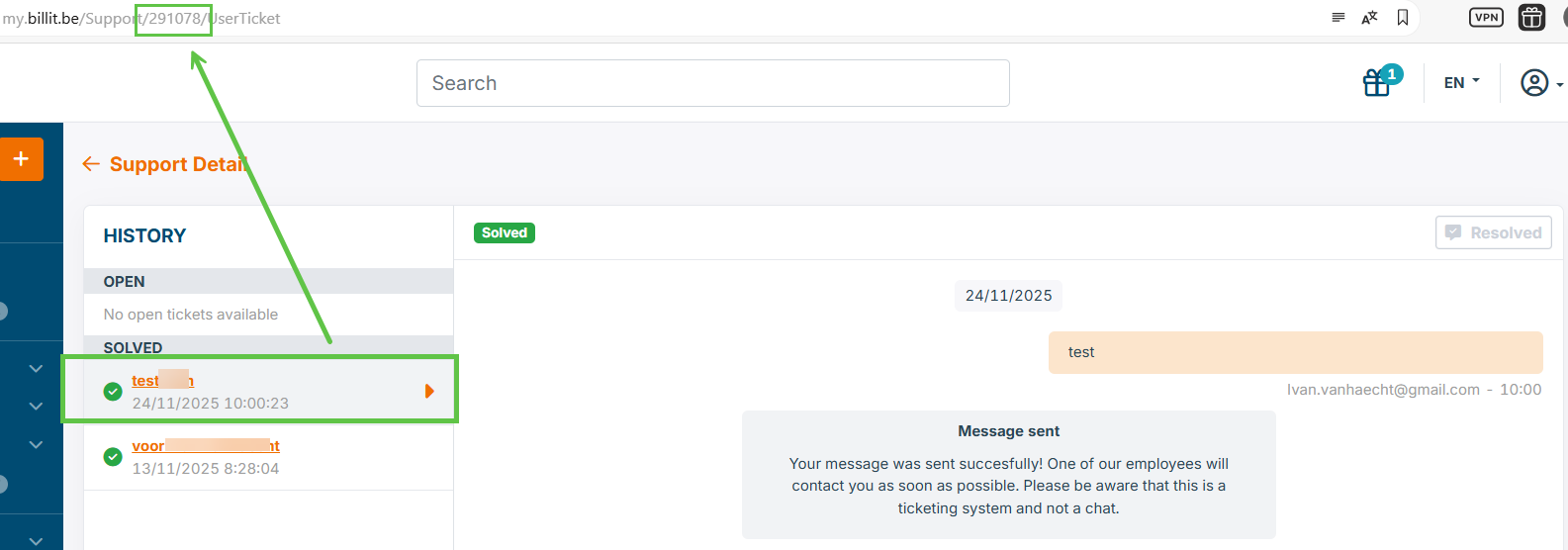 Create Support Ticket from My Billit User Interface