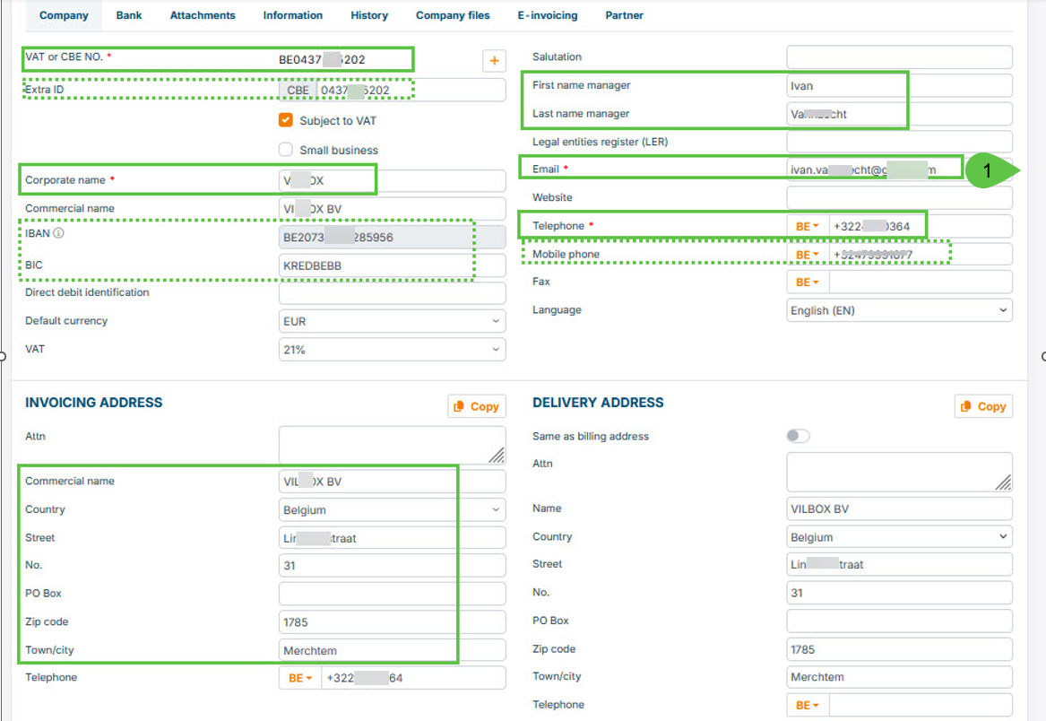 When you click on Phone number or Iban number, and the information is missing, then you are able to fill in the missing information. About the information: