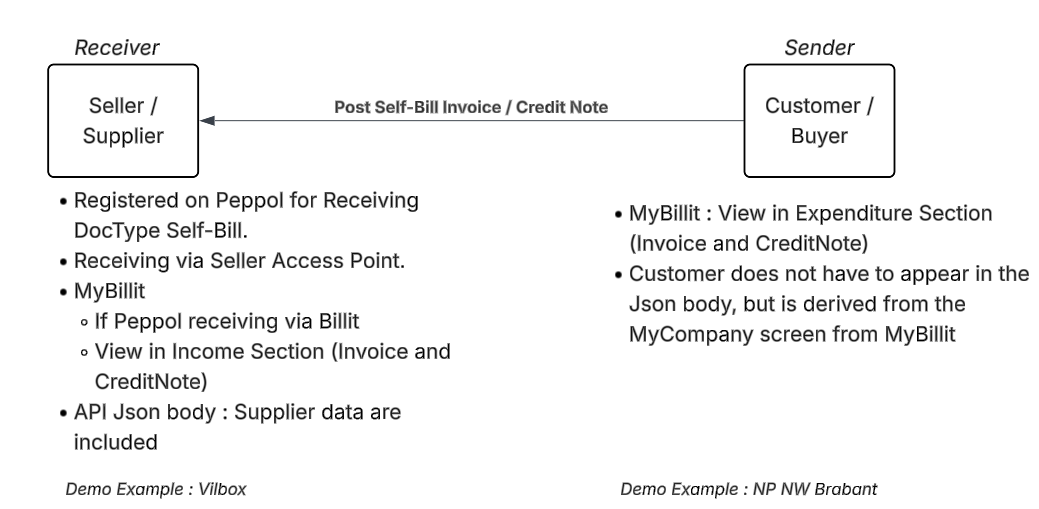 The Seller/Supplier (= Self-Bill Receiver) is mentioned in the API Json body as Supplier. Customer info is coming from the Billit My Company Section.