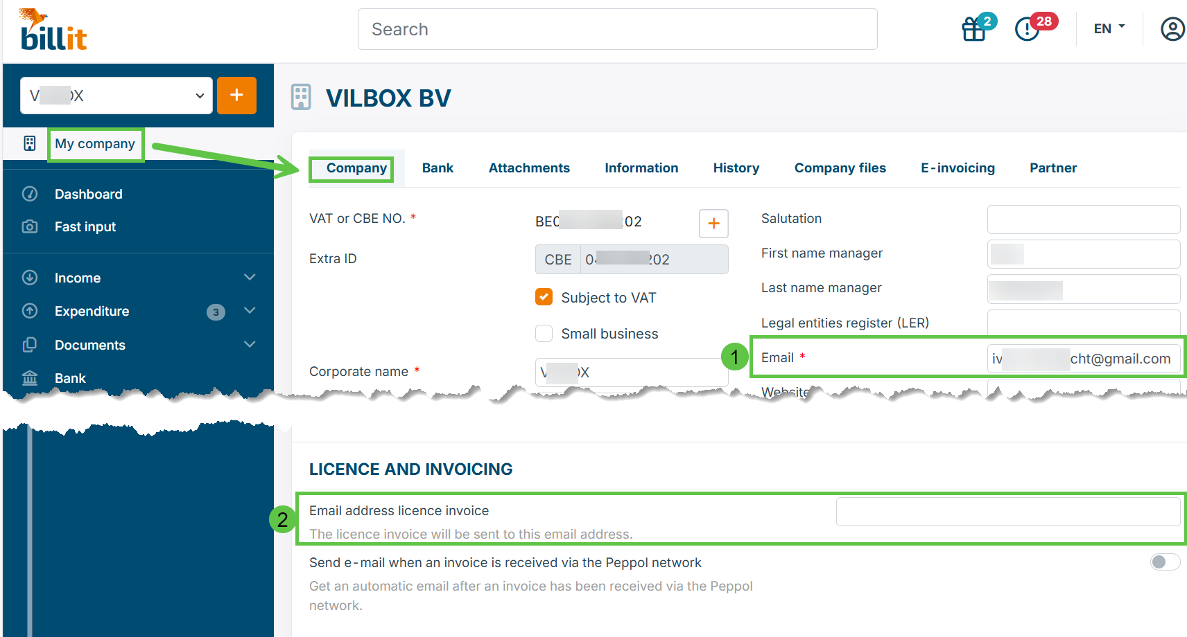 - Seperate field "Email address licence invoice" : here you can define a specific email address for invoice receiving.