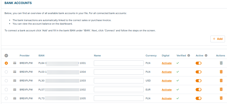 Example of multiple bank accounts created in Billit: