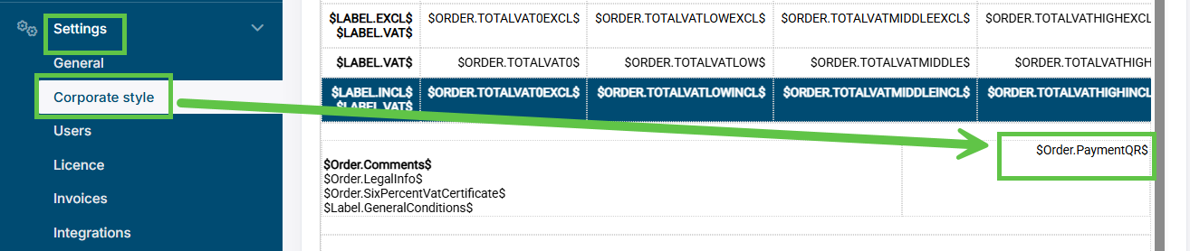 - Go to Settings, Corporate Style. Choose document type Invoice (and possibly also CreditNote).
