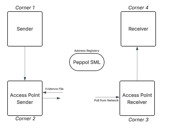 - Access Point of the Receiver (Corner 3) gathers the file, and delivers to the Receiver (Corner 4). When Sender (corner 1) can deliver an evidence file, it is up to Access Point of Receiver (Corner 3) and Receiver (Corner 4) to examine the further processing of the Invoice/CreditNote.